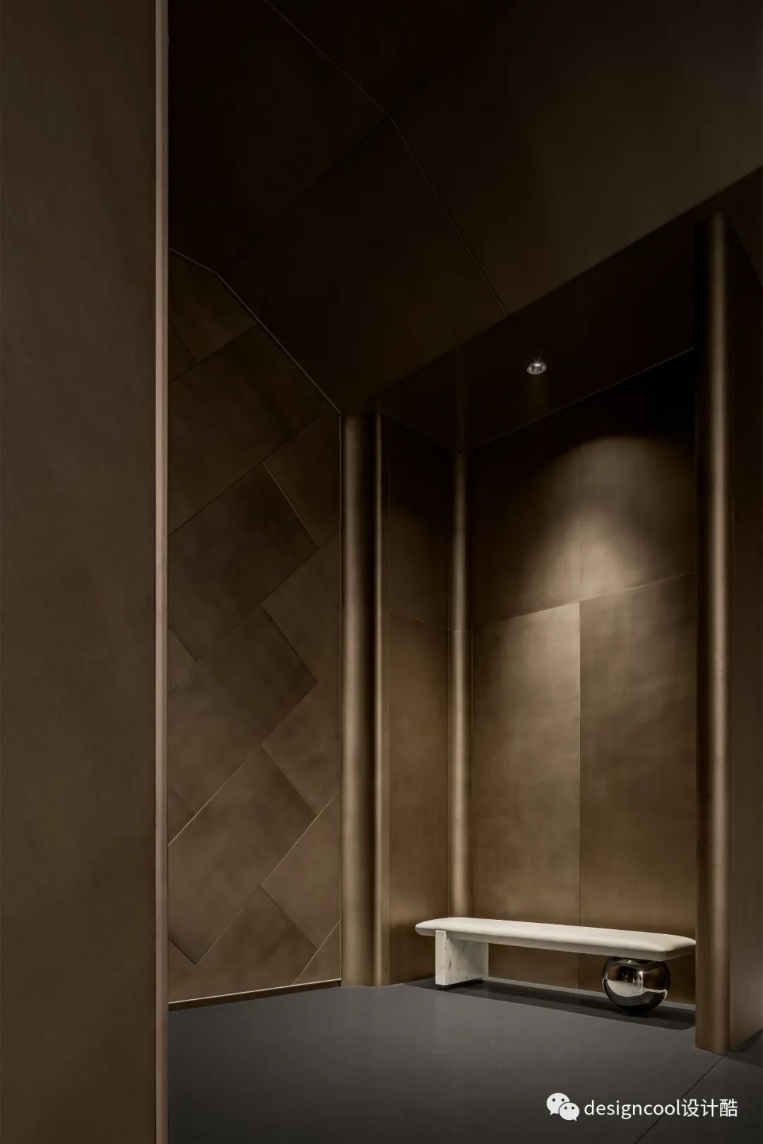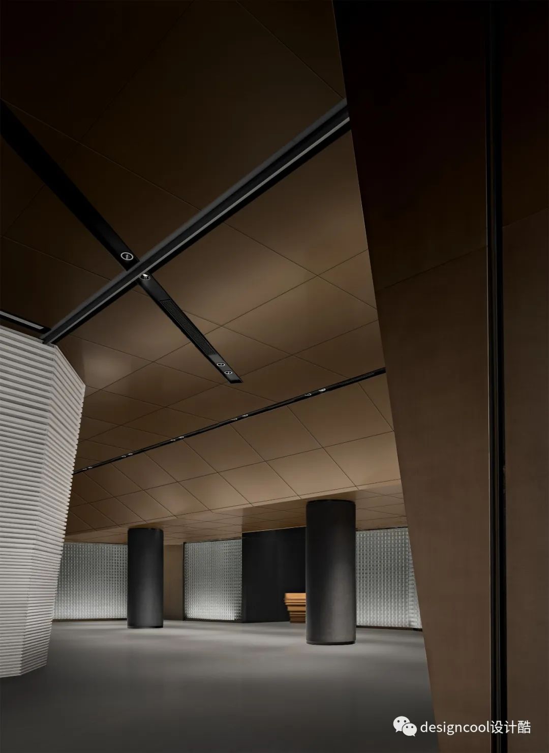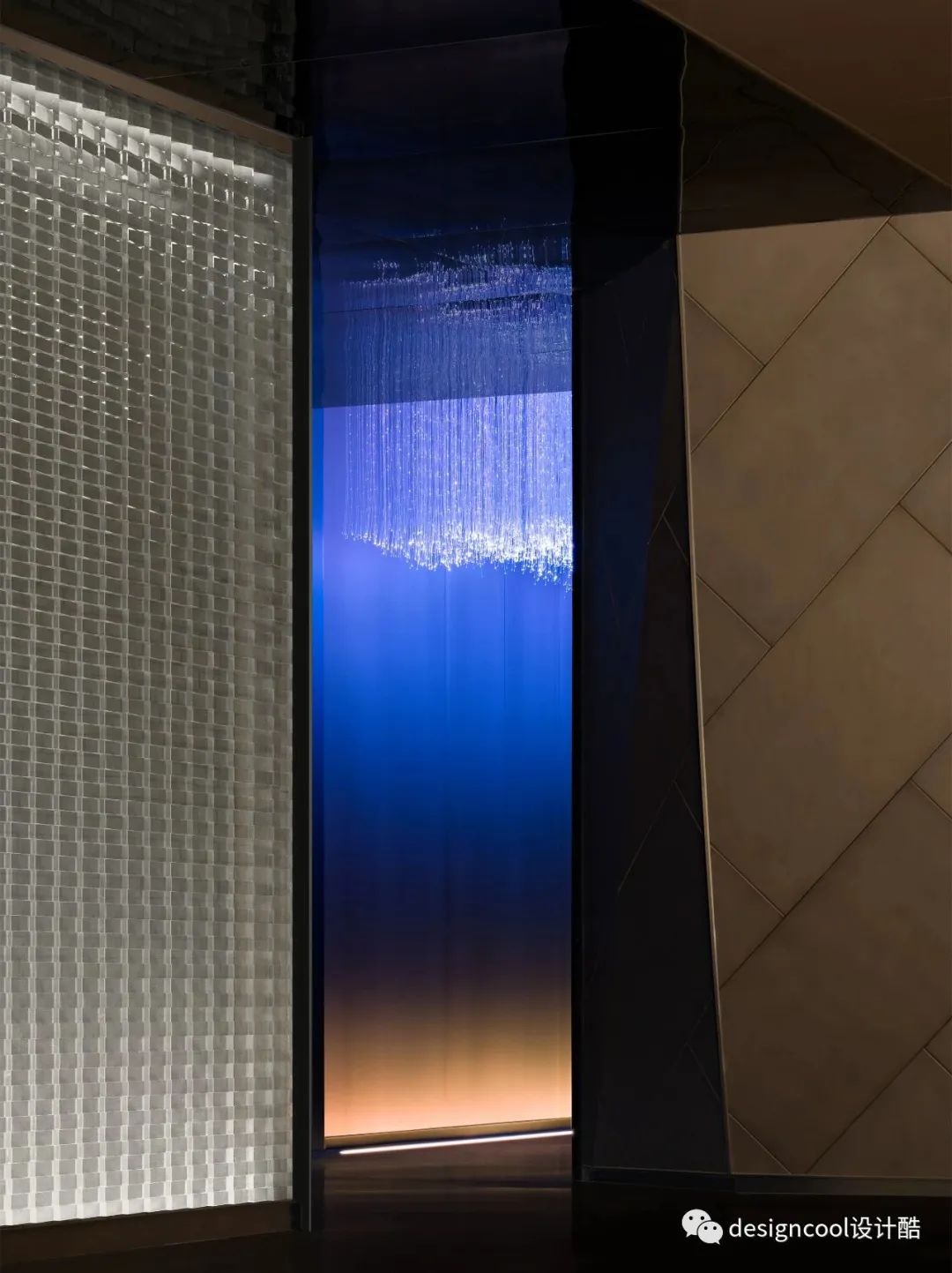 历史、现在、未来排列成无尽的经纬,时间的灰尘将山脉固结为空间内顶天立地的城墙,在时空隧道里山海倾斜、城市扭转,砖瓦在夜幕下散射星辰的银光,星图触手可及。In the space, the modern design of walls resembles the urban fabric and mountain ranges, giving a sense of a fusion of urban history, present and future. The tiles scatter the silver light, viewers feeling that the star map is within reach.