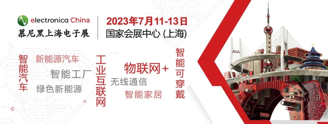 慕尼黑上海电子展(electronica China)将于2023年7月11-13日在国家会展中心(上海)举办。展会汇聚国内外优质电子企业加入,打造从产品设计到应用落地的横跨产业上下游的专业展示平台。展示领域紧跟行业重点,并根据行业实时热点融入新的展示领域,涵盖新能源汽车、智能汽车、绿色能源、智能工厂、物联网+、智能可穿戴、工业互联网、无线通信、数据中心、智能家居等技术话题。