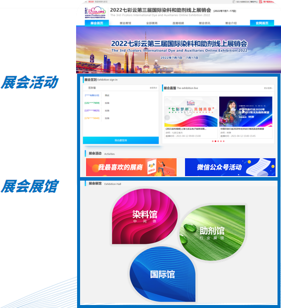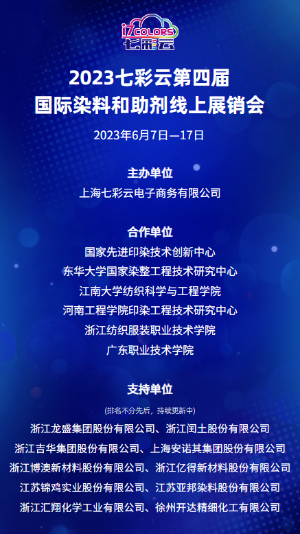 七彩云电商充分利用平台优势、资源优势和会员优势,在中国染料工业协会和中国印染行业协会指导下,策划举办“2023七彩云第四届国际染料和助剂线上展销会”。本届线上展销会设染料馆、助剂馆和国际馆三大展馆,充分展览展示参展企业和参展产品。