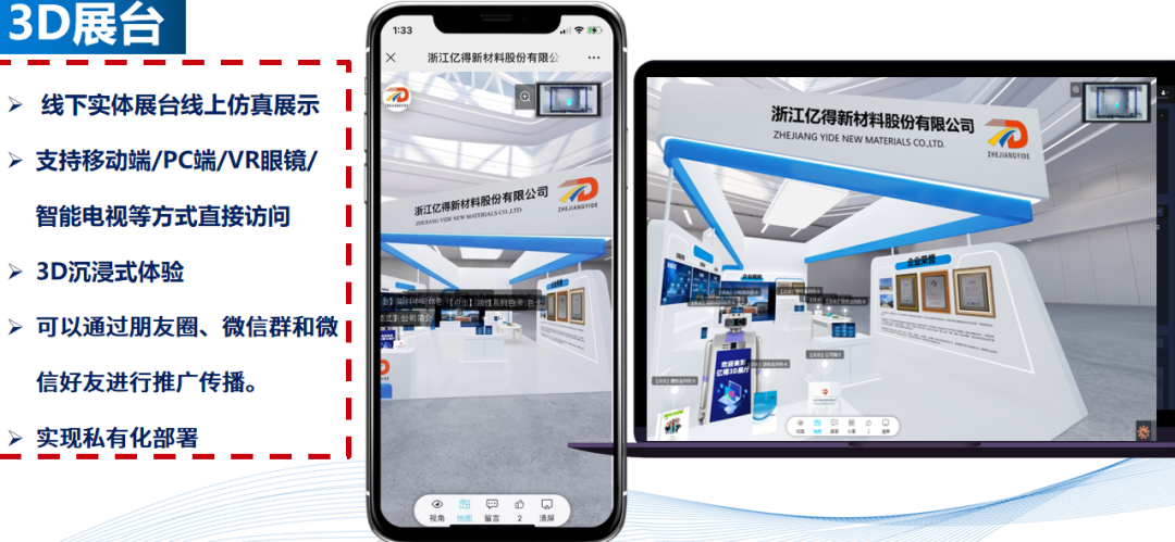 云参展:平台通过PC端和移动端为展商搭建集文字、图片、音频、视频等多种展示方式荟聚的云展台,全方位宣传公司和展示产品。