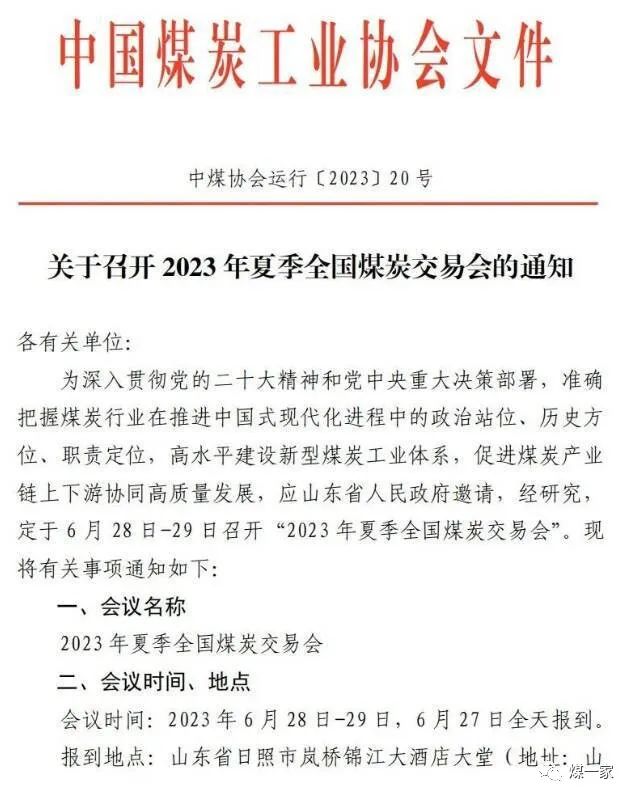 5月29日,中国煤炭运销协会发布的《关于召开 2023年夏季全国煤炭交易会的通知》,2023年夏季全国煤炭交易会将于6月28日至29日在日照举办。