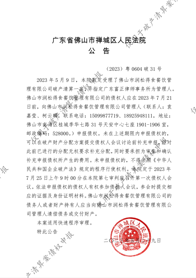 佛山市禅城区人民法院依法裁定受理申请人刘美对佛山市润松得食餐饮管理有限公司提出的破产清算申请,并于2023年5月29日指定广东富正律师事务所为佛山市润松得食餐饮管理有限公司管理人。