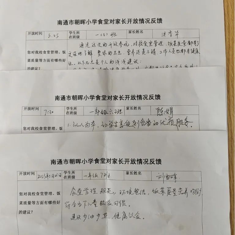 活动最后,家长代表们认真填写了《朝晖小学食堂对家长开放情况反馈表》,对朝晖小学食堂给予了高度评价,充分肯定了朝晖小学的食堂管理工作,并为朝晖食堂管理提出发展性意见,助力朝晖小学在食品安全管理工作再上新台阶。