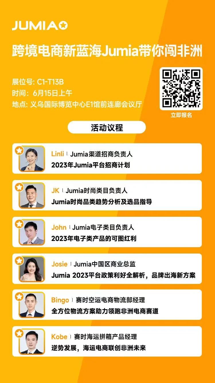 作为全球领先的非洲跨境电商平台,JUMIA将列席本次展会,期待与各位朋友们在展会现场共同交流,详情请查看以下参展信息。