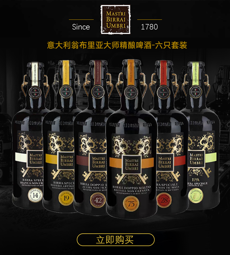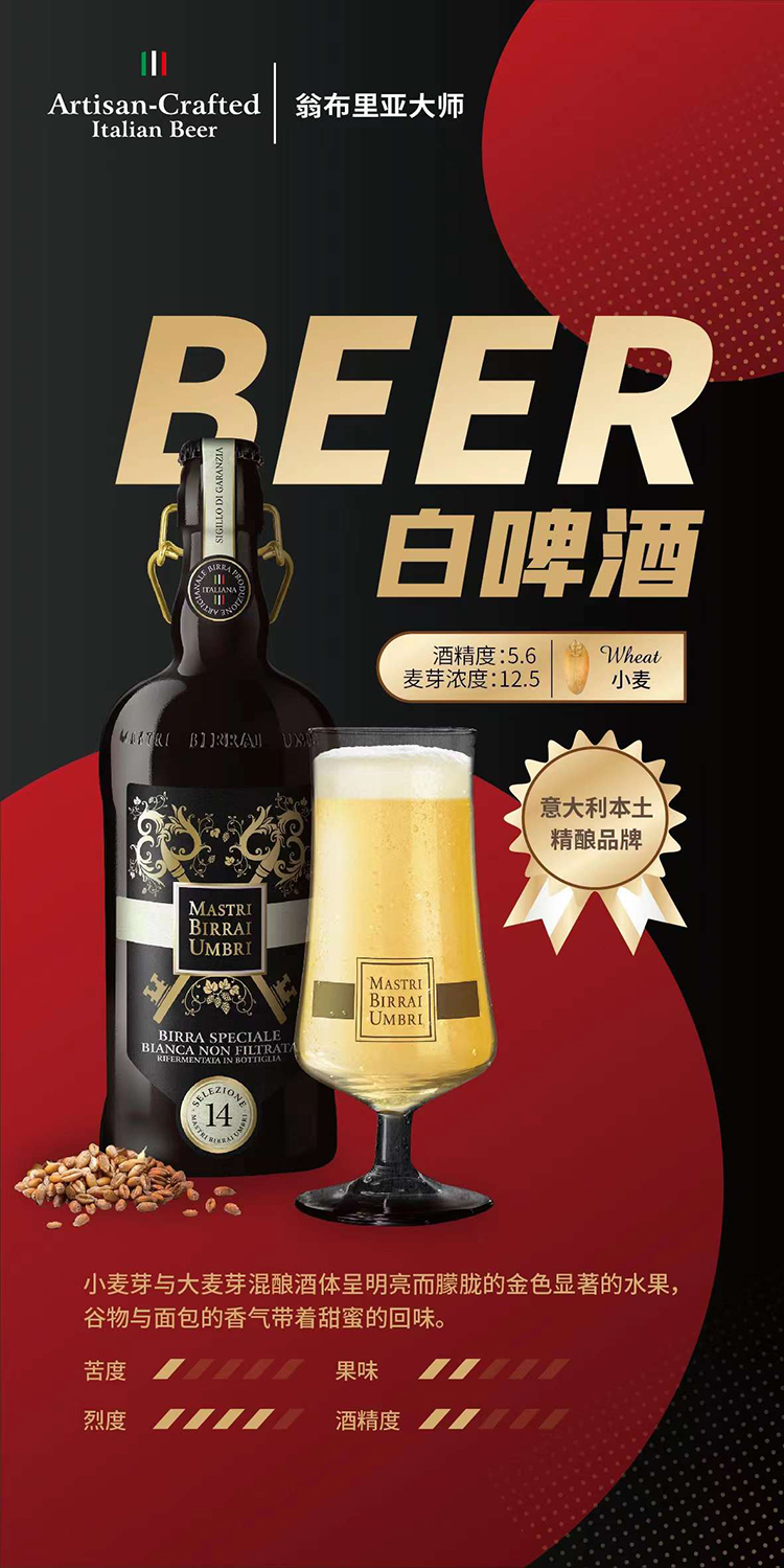 一款好的精酿啤酒,就跟一款好的葡萄酒一样,香气以浓郁而不刺鼻为佳,越好的啤酒,入口后里面的味道就会越复杂,层次感分明,回味越长越好。今天,为大家推荐意大利连续多年销量第一的精酿啤酒——Mastri Birrai Umbri “翁布里亚大师”,它有多爱意大利欢迎?据尼尔森调研公司数据,其精酿市场占有率高达33.5%,大约是2至5名加起来的总和!如果你一开始只是觉得它好看,那就对了。翁布里亚大师精酿的独特酒瓶,就算把喝完的空瓶摆在家里,都是一种艺术美。其设计师为Sergio Pininfarina,也就是法拉利和兰博基尼公司100多款著名超级跑车的设计师!这款精酿也因此被国际酒友称为「啤酒界的法拉利」。好的味道,源自于好的原料。在美丽的翁布里亚,最不缺的就是纯天然的好原料。把水、麦芽、野豌豆和小扁豆等原料的混合搅拌,到加入啤酒花后的糖化和熟化,再到通过涡流桶分离凝固物,用加热之后的冷麦汁再经发酵形成原浆,才能打造出这滴滴香浓的美味口感,让人一秒沉醉。复杂的手工工艺流程,并不能阻挡福奇家族对美味的追求。翁布里亚大师系列的发酵过程,沿用了欧洲最古老的手工发酵,发酵的酒液不经巴氏消毒,不过滤(纯欧洲古法工艺,无任何添加,无嘌呤),让其在打开瓶盖前仍处于发酵状态,直到打开时的那一瞬间,犹如刚摘的水果般,呈现出最鲜活的状态,让每一个品尝过的人都难以忘怀!极致精湛的手工酿造工艺酿出的原浆啤酒,100%优质原料发酵,保留了发酵过程中的活性酵母的酒体,再装进现代工业顶级设计的酒瓶里,采用二次发酵来进一步提高啤酒的香气和口感,这一切,只等您的品赏!