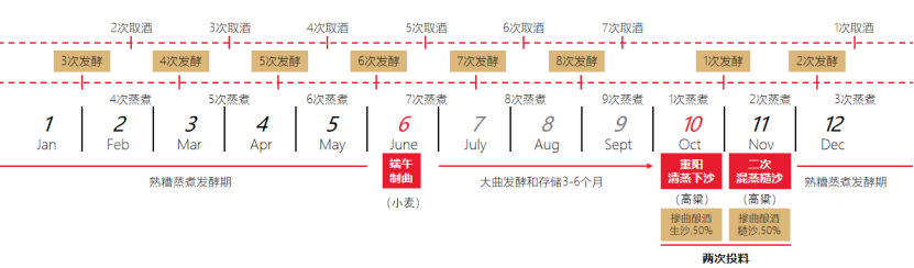 天人共酿,道法自然。历经春夏秋冬四季轮回,一年一个生产周期,两次投料,九次蒸煮,八次发酵,七次取酒,凡30道工序,165个环节。精湛工艺,五年方成。时节变换,严守工序,循循相因、环环相扣,天赋地酝,匠心酿造。正宗酱香之心,于此,生生不息。