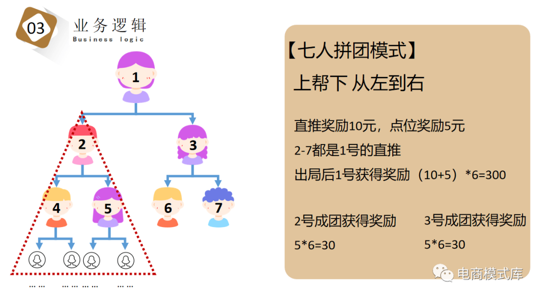 即拼模式,又叫七人拼团模式,采用二二复制和拼团相结合的玩法,有着分裂速度极快,引流效果非常好的作用。其中奖励更加丰厚,远超消费金额,给消费者足够的返利,非常适合白酒行业。