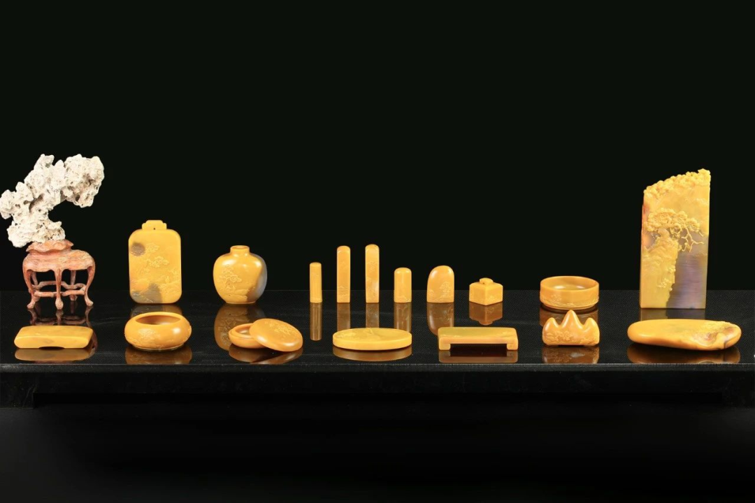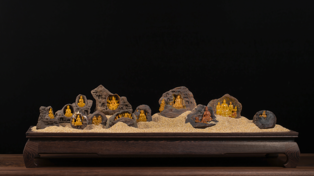 作品简介:作品选材于敦煌艺术元素,千佛圣地、彩绘绚烂,一颗丝绸之路上最闪耀的明珠,其丰富的艺术特征,成为中国乃至世界艺术史上的壮举。作品采用河北宣化战国红为载体再现石窟佛龛造像,运用战国红原石,石头包裹黄肉的特点,石质表现石窟岁月痕迹,肉质表现说法佛像庄严圣洁,形成鲜明对比,具有独特视觉冲击力。