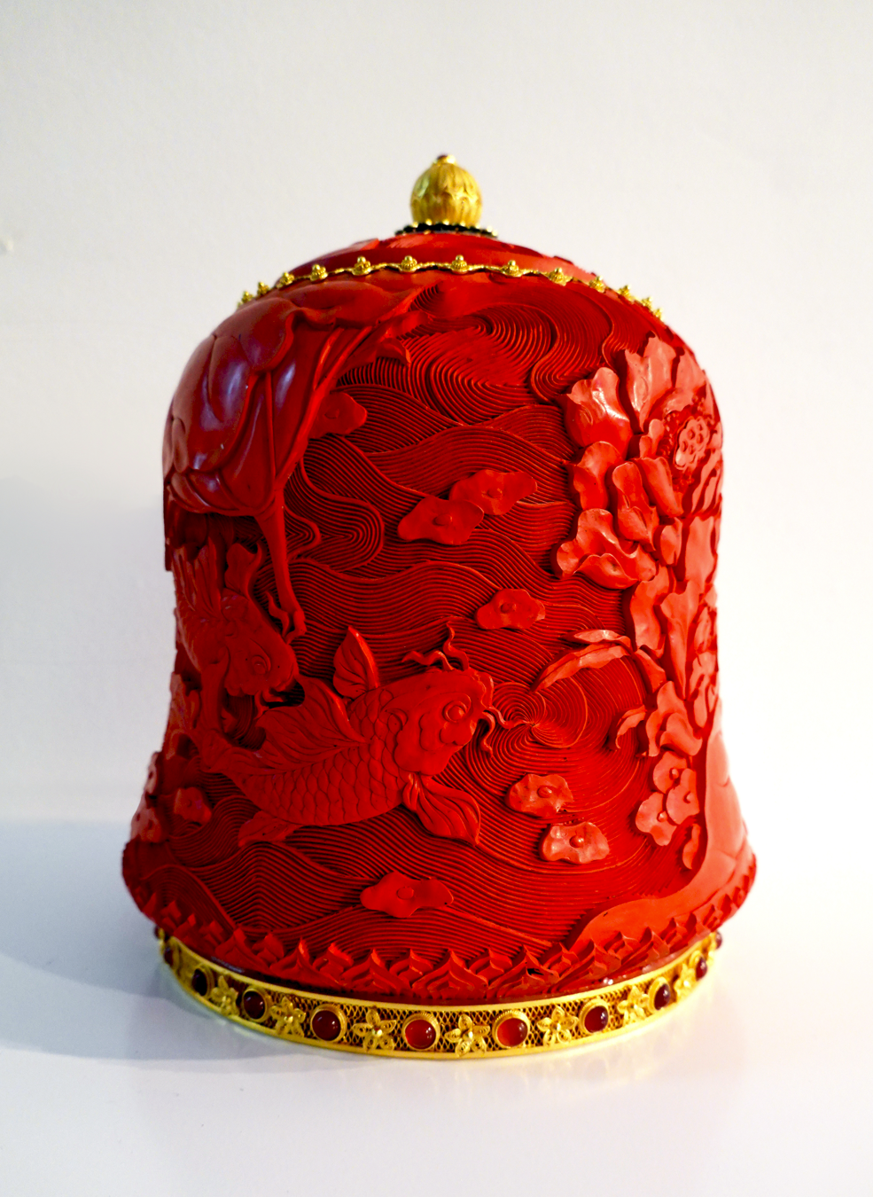 作品简介:“江南可采莲,莲叶何田田,鱼戏莲叶间……”《汉乐府·江南》中的美好诗句,恰是这件剔红作品所呈现的诗意诠释。其实在中国的传统纹样中,金鱼象征金玉满堂,“鱼”与“玉”“余”的读音相近,与莲花谐音“连”组合,还有连年有余的美好寓意,再配合剔红本身的中国红,将国人最为追捧的“喜庆有余”、“连年有余”等美好祝愿和期盼,通过一件器物呈现得淋漓尽致。