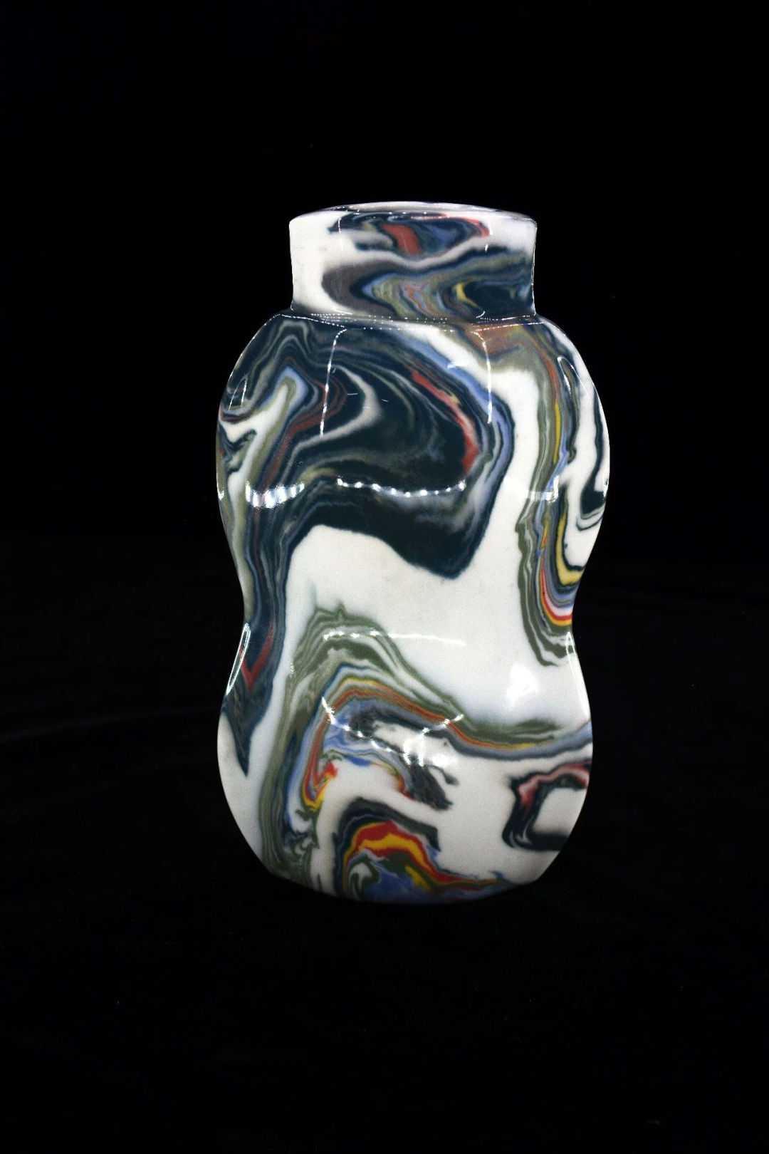 作品简介:作品采用红、蓝、白、黑、黄等多种色泥相间揉和制胎成型,花纹随意自然,如身临高山流水的意境。