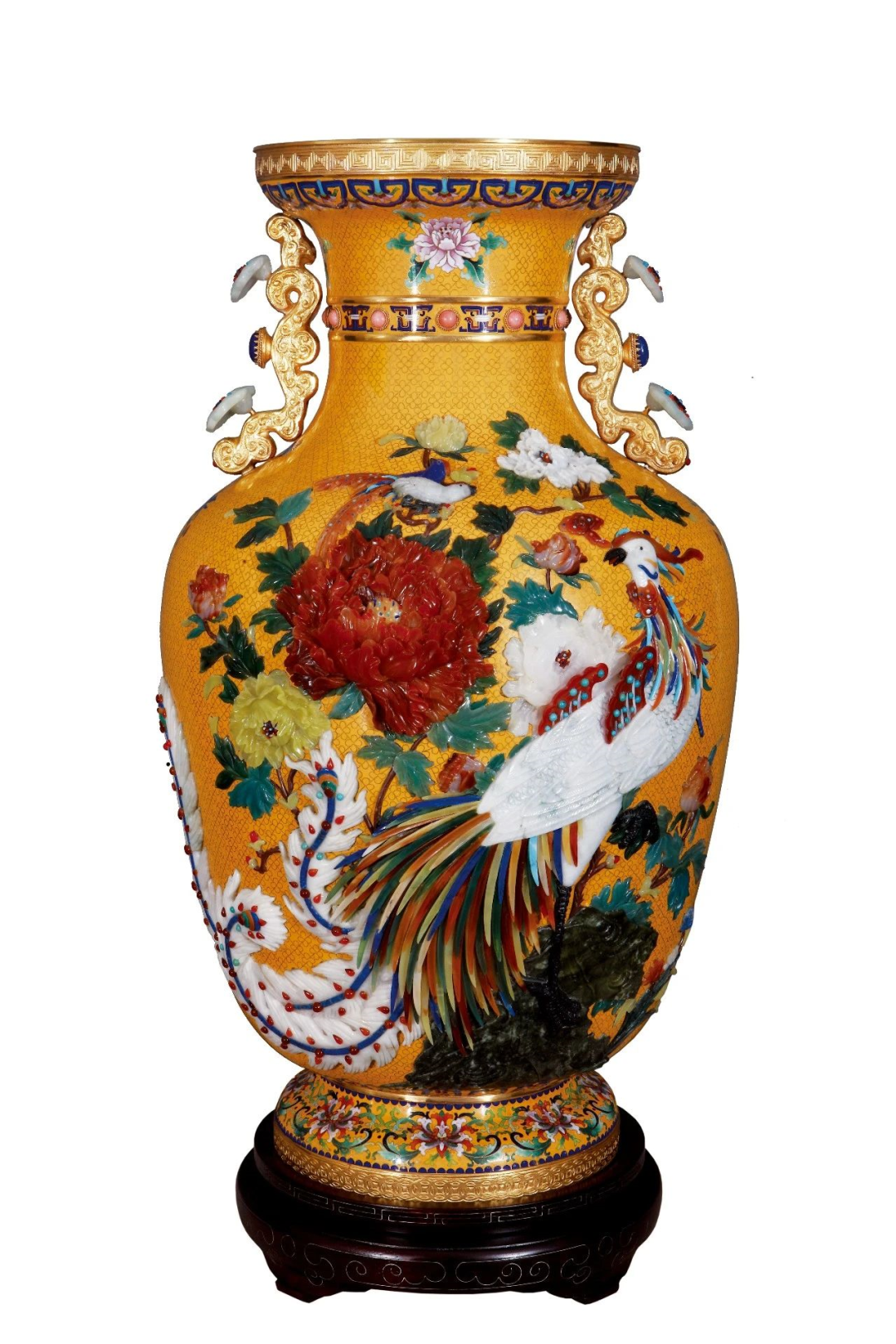 作品简介:迎客瓶为天柱玉立型,盘口,直颈,弧腹,两侧如意作耳,稳健威严,好似皇宫守卫,迎接八方来客。作品以景泰蓝工艺为主体,桂花锦纹铺地,背面饰鹦鹉桃花纹,象征着生机勃勃的春天。瓶身正面凤凰牡丹主图采用世界各地18种名贵宝石嵌于瓶体,精雕细琢,端庄华美,似以盛装喜迎宾客。