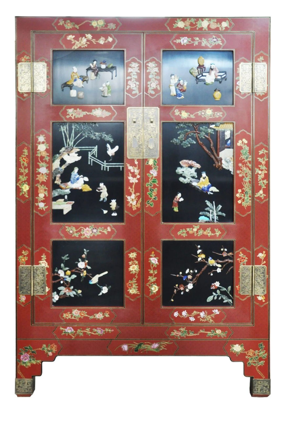 作品简介:作品造型经典,柜体采用雕填工艺雕刻成锦地和花卉图案,色彩柔美,锦地规整,线条流畅。精选寿山石、青田石、巴林石、姜黄石、螺钿、兽骨、岫玉等各种天然名贵材料,以搜、磨、堆、铲、嵌等技法,将人物、花鸟、楼台浮雕镶嵌于漆胎之上,质地晶莹温润,色泽自然纯正。柜体和柜门制作采用雕填工艺做锦地,开光做花卉,取其锦上添花之意。作品精美细腻,极具富丽堂皇的宫廷艺术风韵,给人以高雅、清新的艺术感受,极具收藏价值。