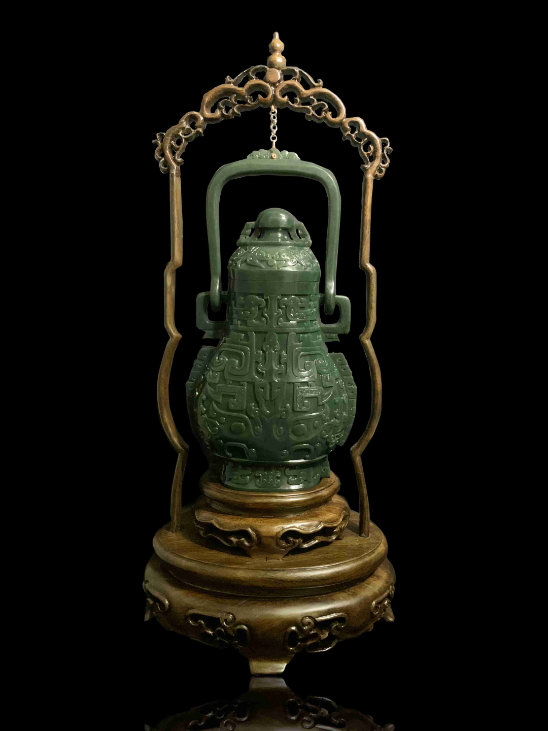 作品简介:作品以青铜器造型而设计,整体造型端庄大气,形制规整厚重,,器型饱满,卣壁均匀无纹,身和盖严丝合缝,正面以兽面纹图案雕刻为主,纹路清晰,雕工精致,提梁把是从整块材料上雕琢而成,足见雕刻师的精心和技艺。