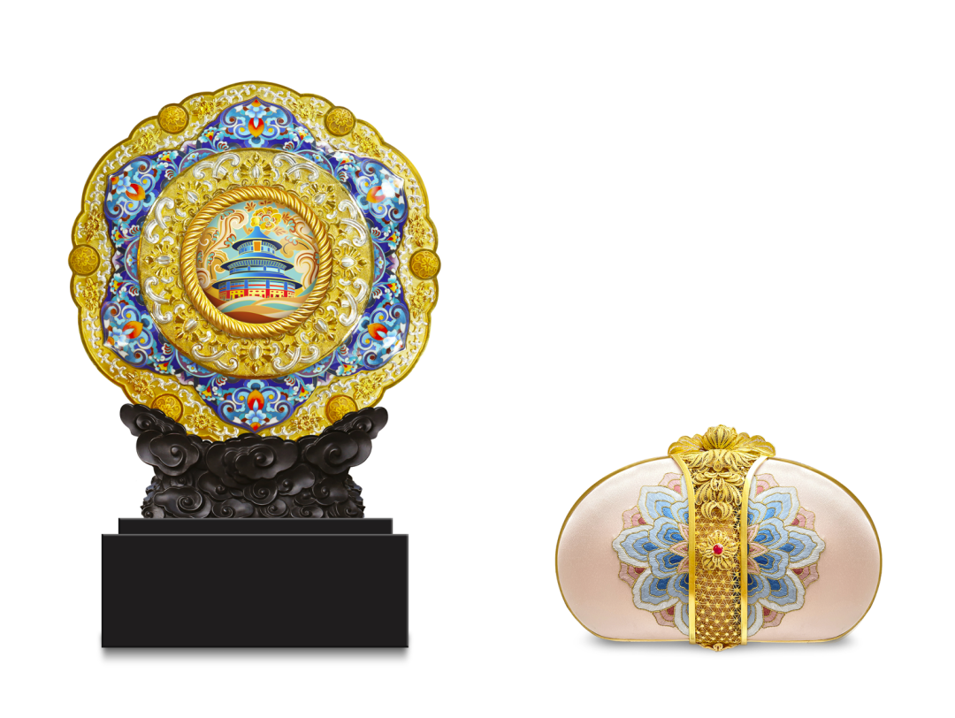 作品简介:作品以景泰蓝工艺和花镀工艺结合,大面积的錾刻配以金银花镀,华丽端庄。整体以天坛为中心,以同心圆向外,分别牡丹花、缠枝纹样。底部云纹,整个造型似云间明月,代表共赏一轮明月,共愿友谊长存。手包结合京绣和花丝工艺精致而成,图案绣以敦煌团花纹样为主,层叠交错,中间花丝部分饰以牡丹纹,寓意吉祥。整体造型现代简约,配色雅致。