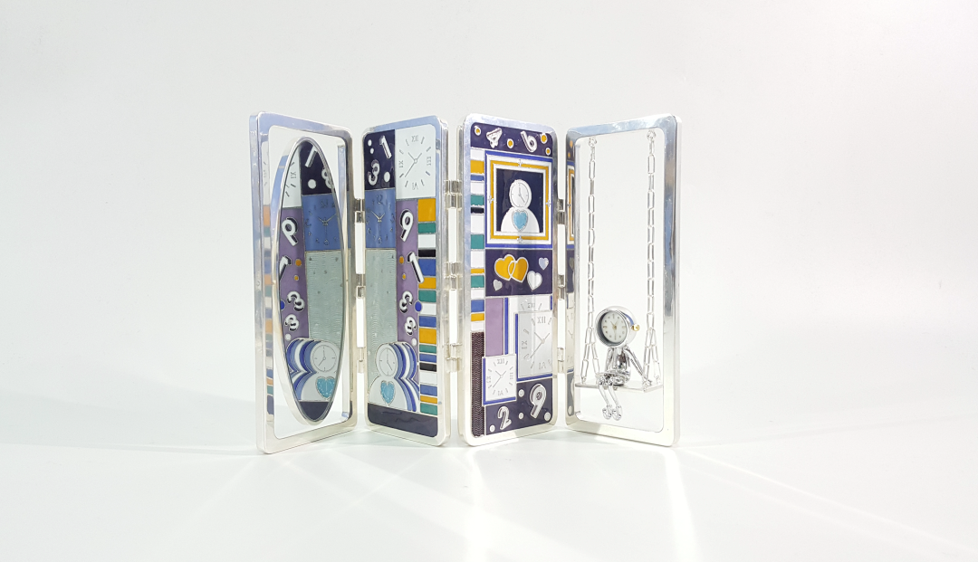 作品简介:作品整体造型为可折叠的四扇屏风,第一扇为镜子;第二、三扇将景泰蓝工艺与银蓝工艺相结合,图案使用CNC进行雕刻,实现线条的粗细、点线面之间的变化;第四扇为面部为钟表表盘的小玩偶造型,坐在秋千上,轻轻拨动可前后摇晃,增加了作品与使用者之间的互动性与趣味性。