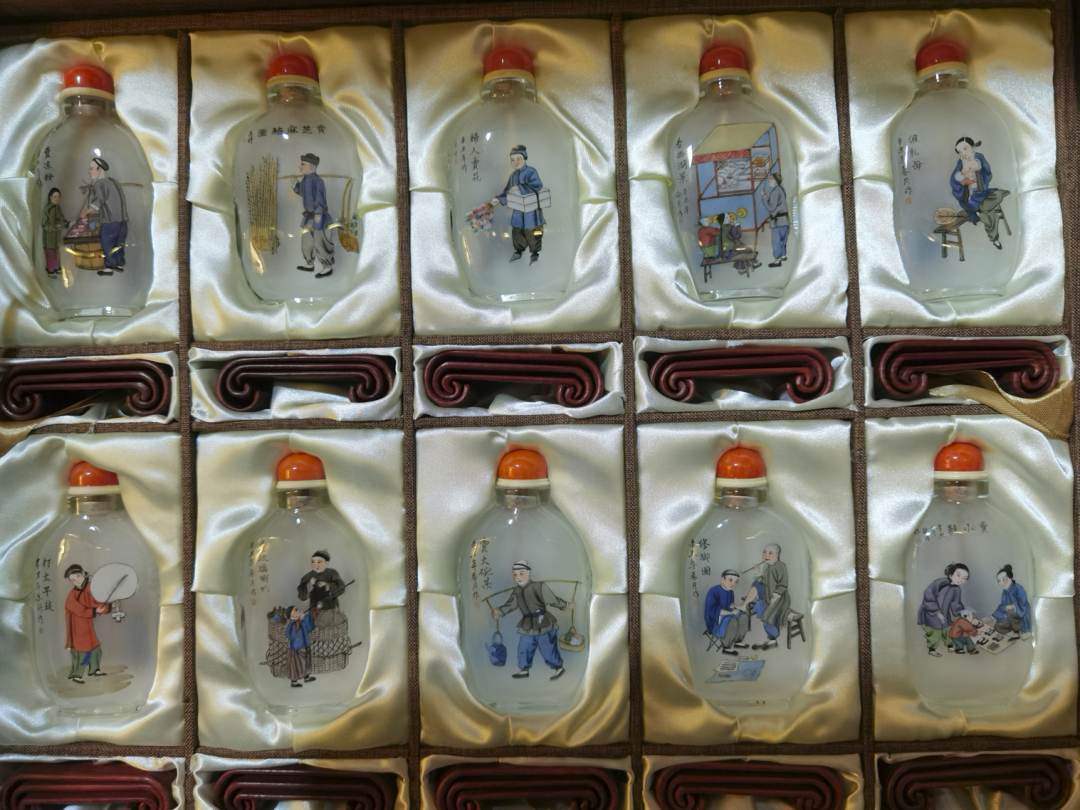 作品简介:内画鼻烟壶《中国民俗百图》一套共50件,每个件分为两面绘有两个图案,一共一百个画面。主要描绘中国旧时各种行业和生活场景,也是对旧中国民俗生活和文化的一个再现。鼻烟壶的坯子手工吹制而成,绘画采用中国内画传统技法精心设计绘制,历时二年时间完成。