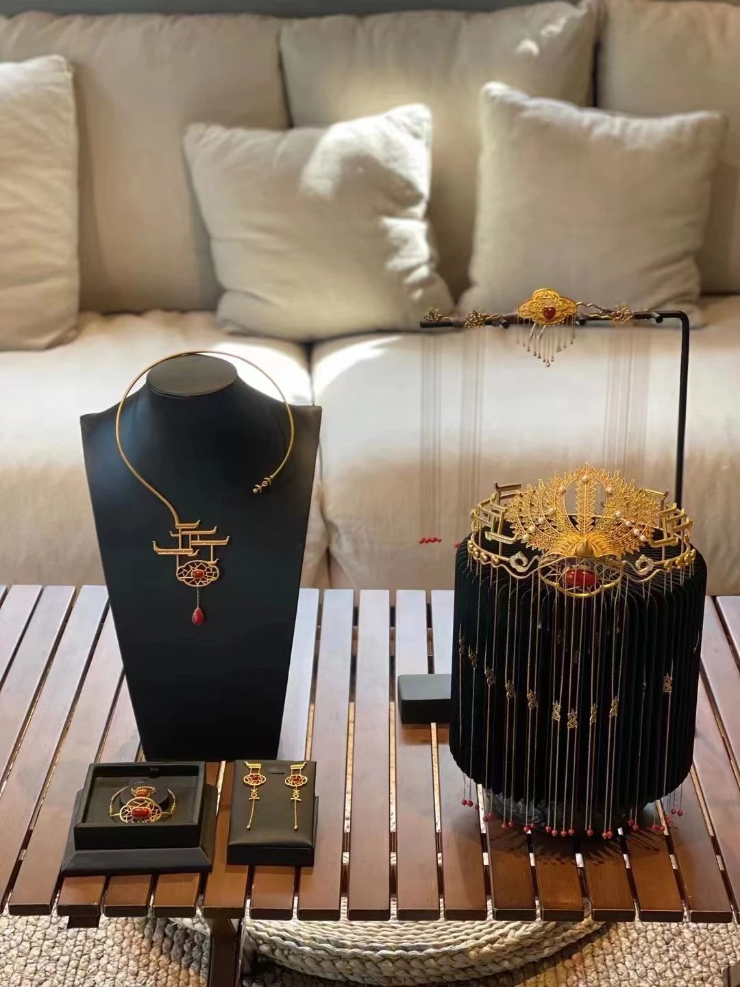 作品简介:作品在传承中国传统文化“待字闺中”的基础上展现婚嫁主题。采用24k纯金、阿卡珊瑚、akoya珍珠等珍贵材质。选用传统屋脊线,窗棱和喜字三个元素,并对之进行改良,区别于传统首饰的风格,更适合现代审美和佩戴。