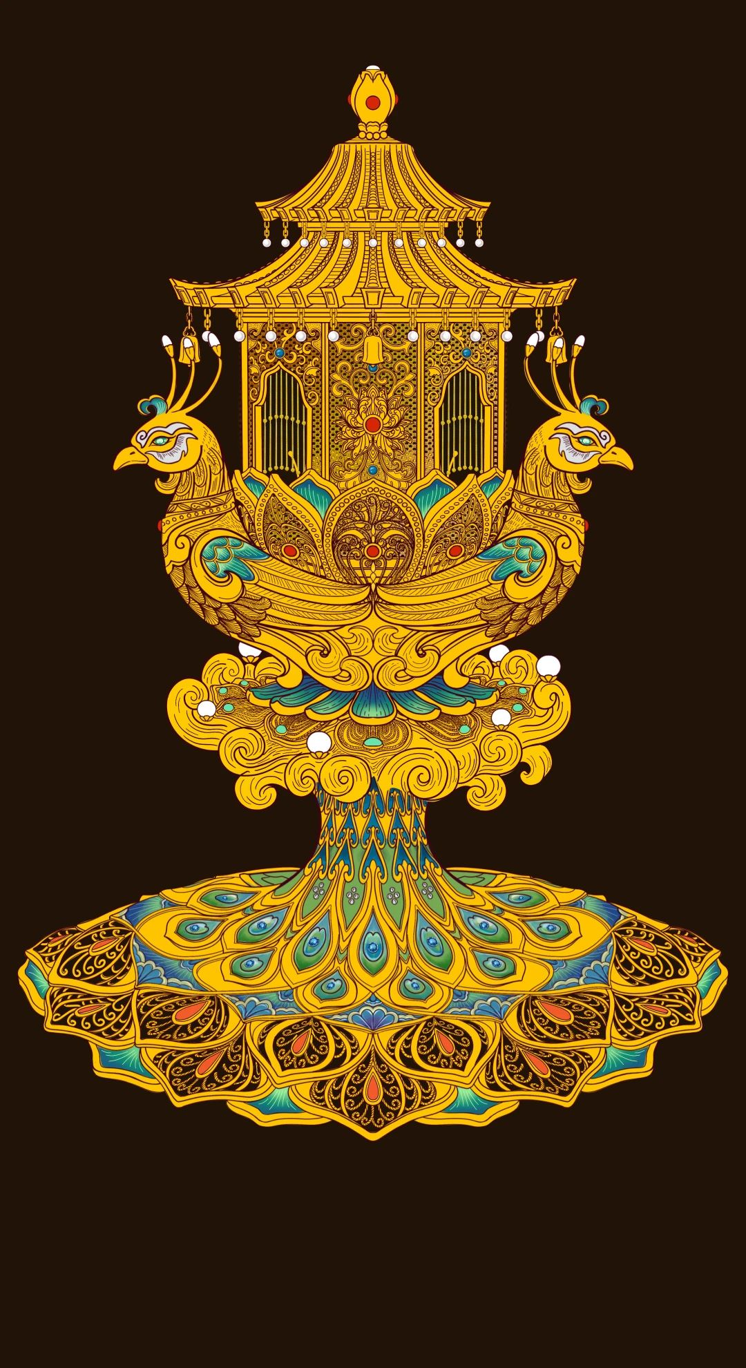 作品简介:作品方案以孔雀开屏的羽翎演化为柱,自下而上升腾出如云如海的平面,随后又渐渐幻化出孔雀圣象,犹如羽化升仙般绽放而出。展现出孔雀的圣洁、高贵与神圣。其双翅环扣,守护在圣莲左右。层层花瓣将亭身包裹,透过缕缕珠帘,隐约看到中心一颗莲心,好似静心禅坐的修行者一般,不受外界侵扰。上托的12只花瓣轻柔展开,象征着有圆满之意。
