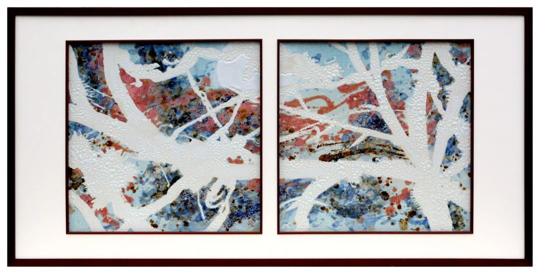 作品简介:作品为高温颜色釉瓷板画,创作于2023年春,以剪影的手法,用高温颜色釉窑变的效果来表现夜晚的月移花影的绝妙景色。