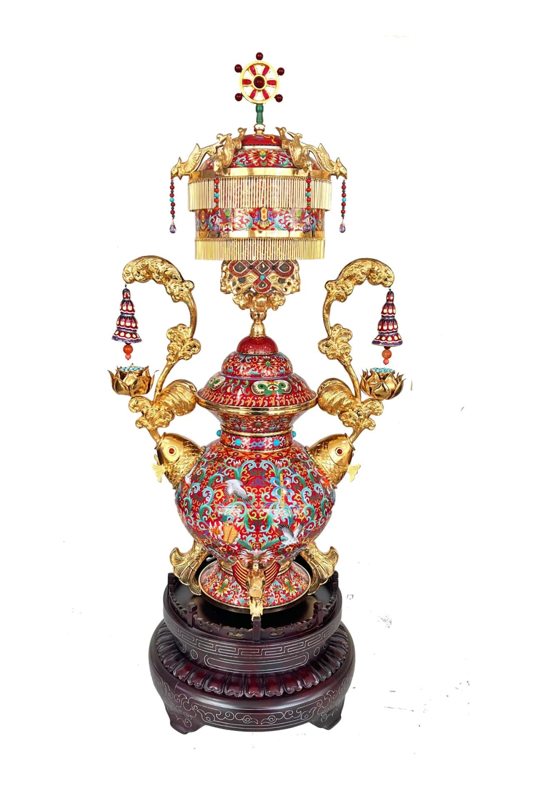 作品简介:作品以佛教中的吉祥八宝为创作主题,将八种吉祥法器宝瓶、宝盖、双鱼、莲花、右旋螺、吉祥结、尊胜幢、法轮的立体造型巧妙结合,造型立体生动、高雅别致。精致的錾铜鲤鱼口吐水花,宝螺悬挂于水花之上,与荷花相互辉映,法轮置于宝盖之上,犹如佛光普照。景泰蓝亮丽的洋红釉色、玉石的配饰及宝伞中的流苏更彰显贵气。纹饰中细腻精湛的掐丝工艺,表现出了景泰蓝精美华丽的艺术效果。