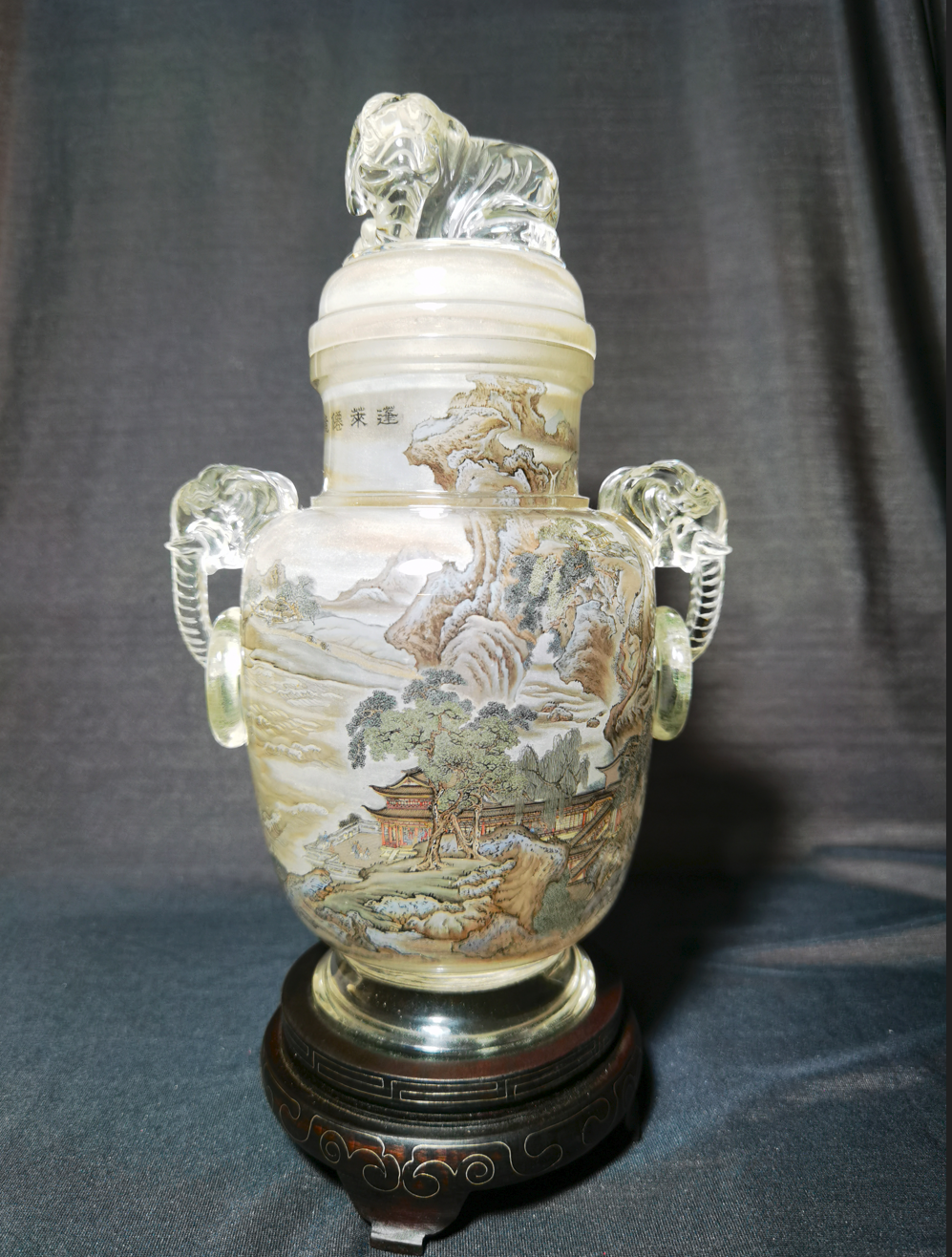 作品简介:作品以传统的内画鼻烟壶技法与水晶雕刻摆件瓶的完美结合,在内画载体上有了创新,由于瓶子体积大传统的鼻烟壶很多,增加了极大的绘制难度,此件作品所描绘八仙渡海口山川湖海吞吐日月的宏伟场面和壮丽景象。