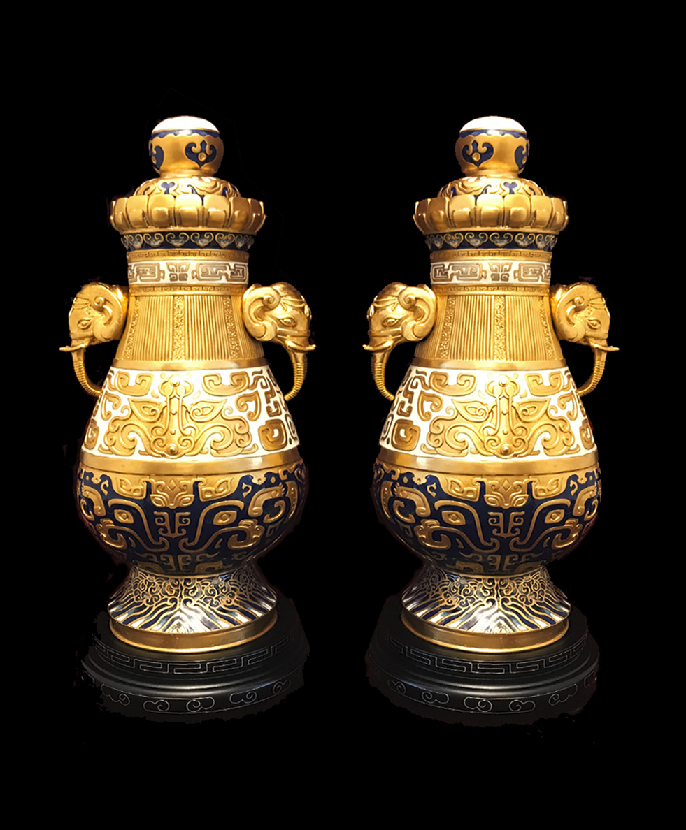 作品简介:作品顶盖錾刻如意宝莲花,耳部如意象首,瓶身饰如意纹、宝相花、如意龙纹、如意象纹、吉祥龙凤纹和底部海水江崖构成,展现江山永固,万代吉祥等美好主题。作品整体古朴典雅、恢弘大气、庄重华美。以古老的錾胎珐琅工艺,融入创新设计的作品,将古今文化精髓提炼凝聚一身,成就新时期工艺精品。