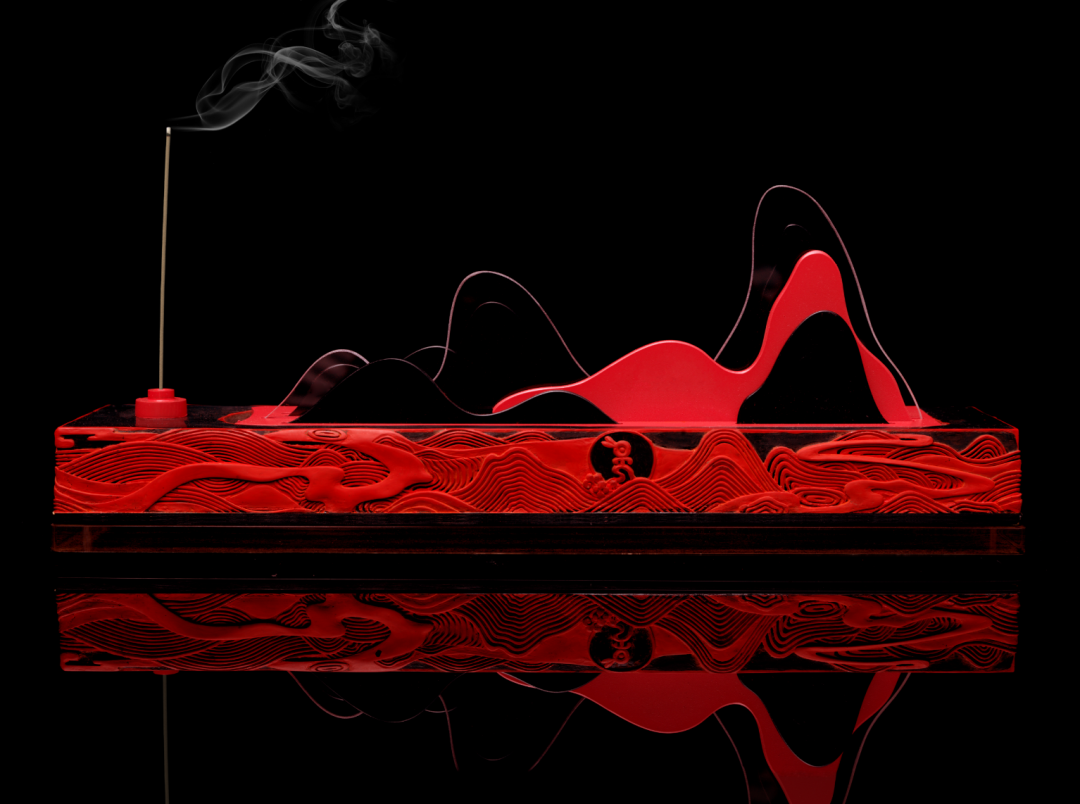 作品简介:作品同时兼具香插、香盘和香筒收纳功用。将现代审美与传统文化传承相结合,整体造型朴拙,构成线与面、疏与密、虚与实的对比。香具上层由天然漆片与亚克力插片透叠呈现山的剪影,犹如淡淡水墨;纹饰以剔犀工艺语言表现山色、日光和月影,相映成趣,气韵不绝。
