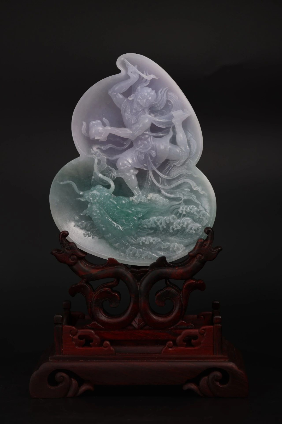 作品简介:作品乃是冰种,春带彩雕刻而成,外型呈葫芦状。绿色玉质雕刻从海浪中奔涌而出的鳌头,紫色玉质雕刻而成的魁星独站在鳌头之上,魁星一手拿着官帽,一手点着右脚托着的玉斗。