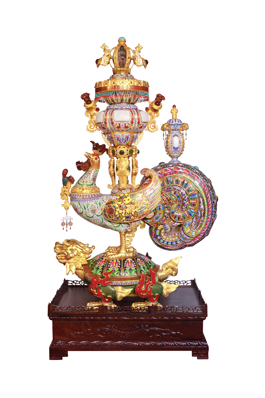作品简介:作品是一件由景泰蓝、玉器、錾刻及内画相结合的大型作品。以金鸡为主题,利用鸡的谐音“吉”来表达吉祥如意。鸡背上的大宝莲灯上方镶嵌珍贵的松石顶,内画旋转球图案为盘古开天辟地。宝莲灯周围装饰着珍贵的绿松石以及用红珊瑚做成的流苏,与鸡尾上的小宝莲灯遥相呼应,尽显高贵、璀璨与辉煌。作品整体结合巧妙,工艺精湛,表达了对我们伟大祖国“基业长青,江山永固”的美好愿景。