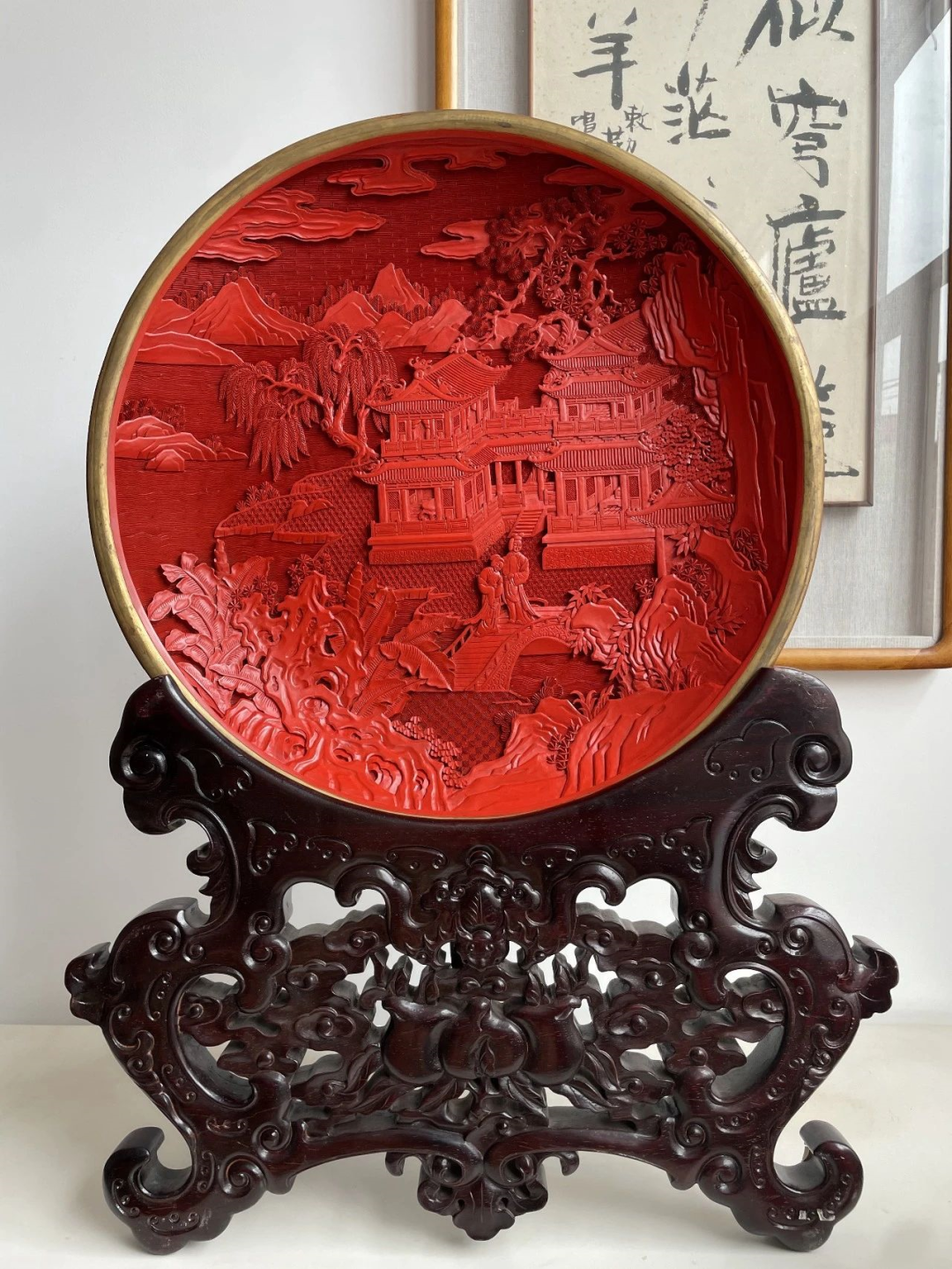 作品简介:作品用剔红的技法以西厢记为题材刻画了一幅精美的雕漆作品画面,此件赏盘刻画的房屋建筑极为考究,有着中国古典建筑的精髓,小桥流水,园林拱桥,人物形态鲜活生动,作品整体变化多样,层次多变,构图合理,展现出中国漆器的精美,体现出中国古老传统文化的无限魅力。