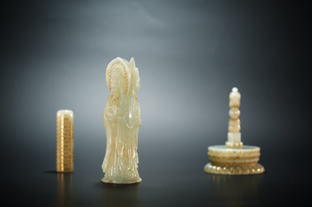 作品简介:三面观音手持经箧、莲花、念珠,象征智慧、平安、仁慈。观音内部中空,暗藏经筒、经文、法器,层层套叠,精心巧妙。作品构造静中有动,动中有静,静中又纤巧灵活、多面、多层,让人观后有所感悟,有所触动。以达到让见者观工艺之巧、赏金玉之美、体佛法之秒而树天地之气。