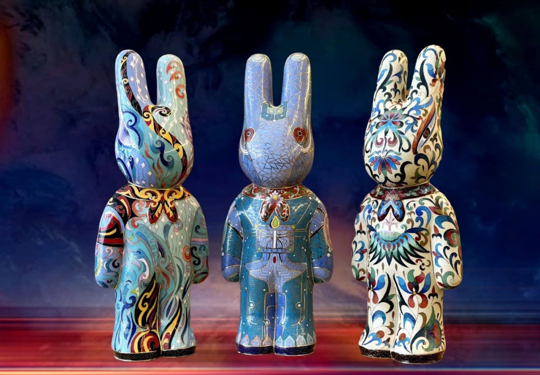 作品简介:作品《灵兔吉瑞》的设计元素是一种拟人化形象的兔子,运用景泰蓝工艺制作,服饰设计了中国科技芯片纹样代表着现代科技“以芯焕新”的理念;以星月炫彩纹代表着星月皎洁、梦入蓝桥的幻想;以质朴的敦煌壁画元素展现的异彩纷呈的美轮美奂,这3种不同纹样,以一种新潮的景泰蓝艺术表现方式,激发非遗技艺的创新、创造活力,衍生中国艺术新表达。