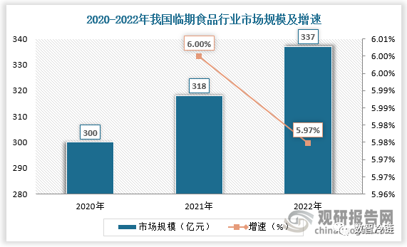 根据观研报告网发布的《中国临期食品行业现状深度研究与未来投资预测报告(2023-2030年)》显示,随着消费者消费观念的转变,临期食品逐渐成为了市场上的热门产品,行业市场规模持续扩大。根据数据,2021年我国临期食品行业市场规模为318亿元,较上年同比增长6%;2022年我国临期食品行业市场规模约为337亿元,较上年同比增长5.97%。