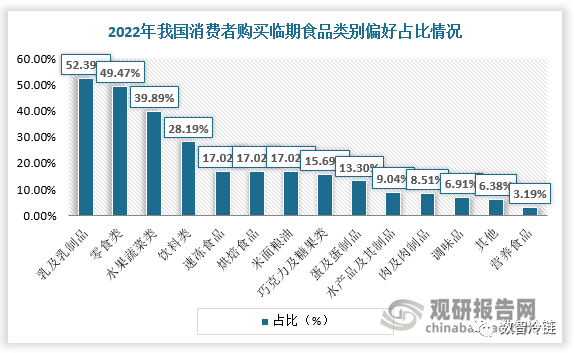 从消费者偏好来看,消费者选择临期食品时倾向于保质期较长或者即买即食的品类。数据显示,2022年临期食品中乳及乳制品偏好占比超50%,为52.39%。除此之外,零食类、蔬菜水果类和饮料类临期食品占比较高,分别为49.47%、39.89%、28.19%。相比之下,水产品及其制品、肉及肉制品、调味品、营养食品占比较小,分别为9.04%、8.51%、6.91%、3.19%。