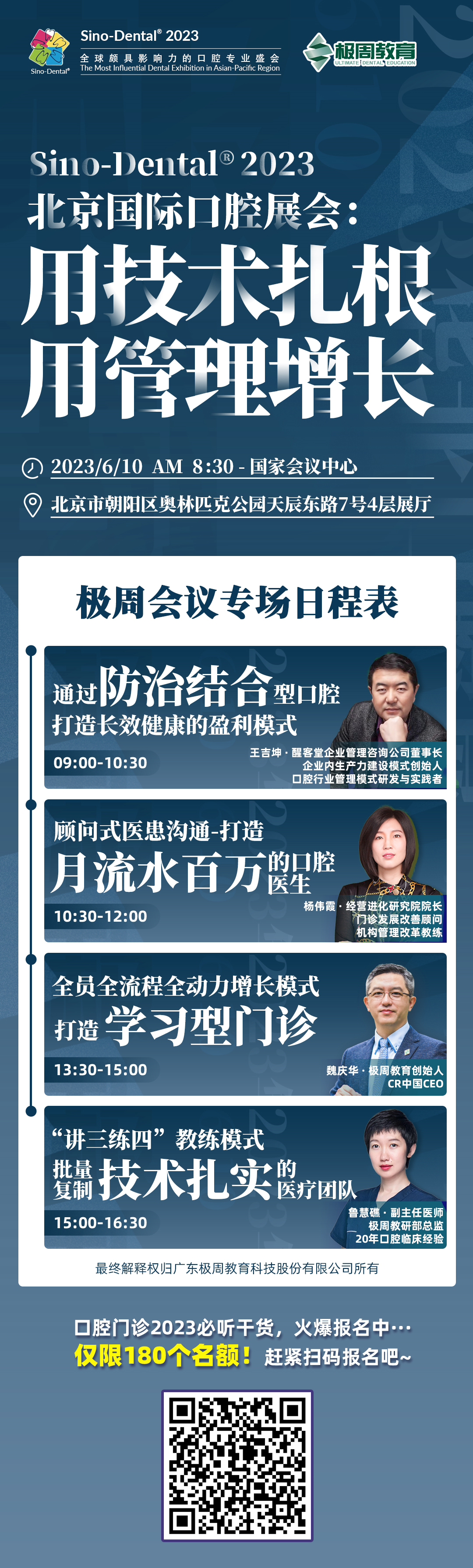 王吉坤老师、杨伟霞老师、极周魏总、鲁医生将分别与大家探讨——当下口腔门诊盈利与增长模式,以及如何打造技术扎实、沟通致胜的医疗团队。