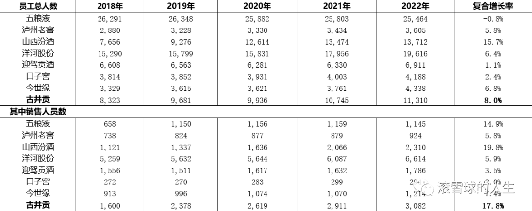 管理层19年提出“全国化,次高端”,逐步向省外扩张,从两点可以看出其战略布局:一是经销商队伍,经销商数从19年末的2951家,增长至22年末的4439家,净增加1448家,其中接近一半来自华中以外地区,经销商数持续高增长,在去年疫情较为严峻的情况下同比还增长了14%,华中以外合计达到1662家。而近几年其它白酒品牌经销商数基本维持相对稳定;二是员工人数,18年至今净增加2987人,复合增长8%仅次于山西汾酒,其中主要为销售人员的增加(1482人),5年增加的销售人员甚至超过了很多其它白酒企业的总销售人数,疫情三年,几家欢喜几家愁,对比其它行业,别人还在为生计奔波之时,它却在蛰伏前行。这是我看好它的第二点。