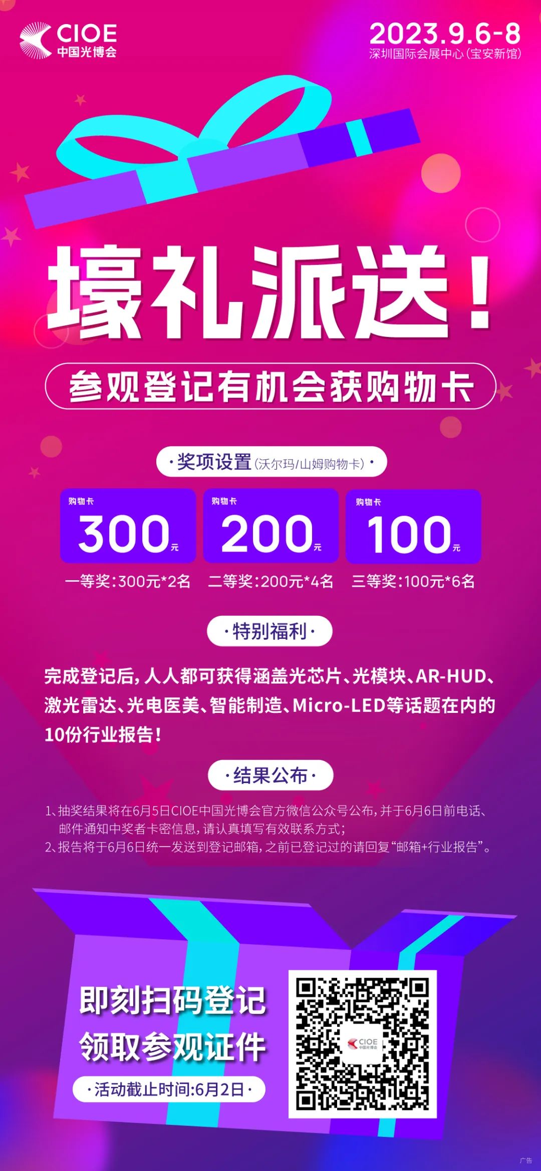 点击完成参观登记,不仅可以一证看遍光电全产业链、全球光电资源触手可及,还有机会获得最高价值300元沃尔玛/山姆购物卡!(截至6月2日前所有登记人员中抽取)