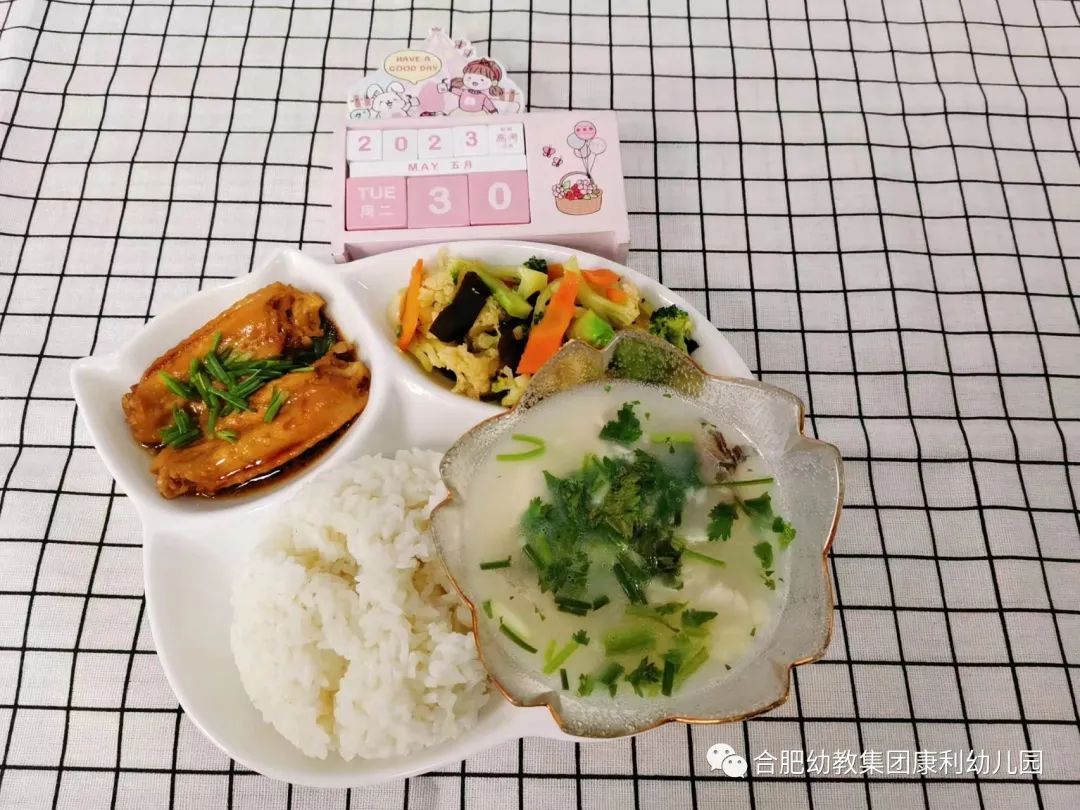 午餐:香米饭、秘制鸡翅、木耳烩双花(西兰花、花菜、胡萝卜、木耳)、奶白鱼头汤(鱼头、豆腐、胡萝卜、香菜配色)