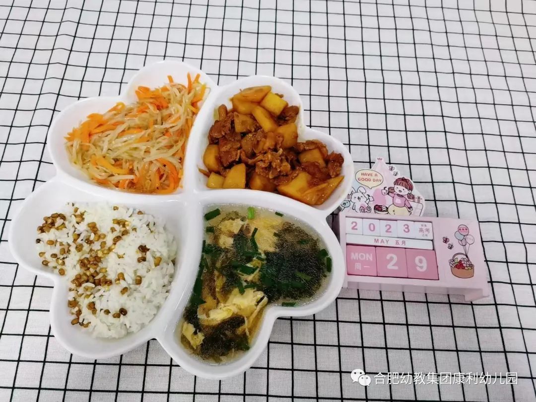 午餐:绿豆米饭、咖喱土豆牛肉、清炒银芽丝(绿豆芽、胡萝卜)、虾皮紫菜蛋花汤