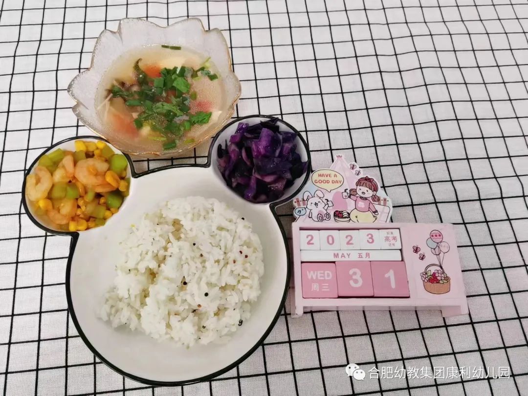 午餐:藜麦米饭、玉米炒虾仁(莴笋、玉米粒、虾仁)、爆炒紫甘蓝、酸辣汤(西红柿、金针菇、内酯豆腐、方腿、木耳、香菜)