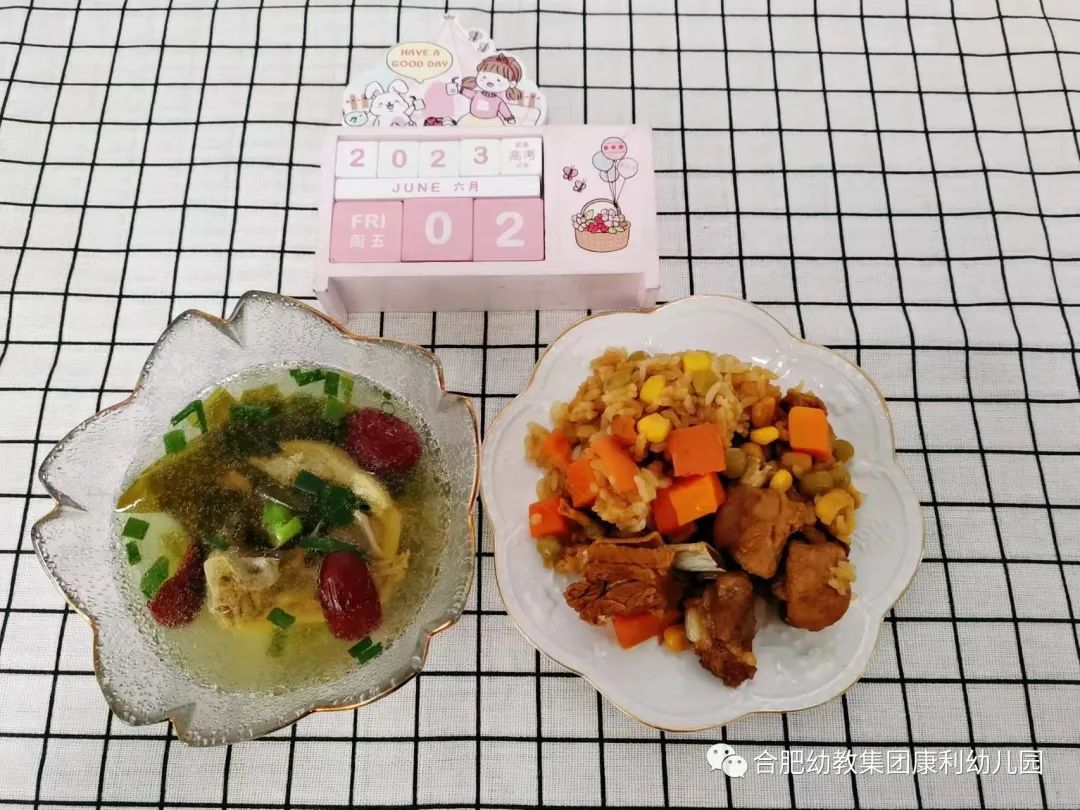 午餐:排骨焖饭(排骨、胡萝卜、豌豆、玉米粒)、海带老鸭汤(少量红枣)