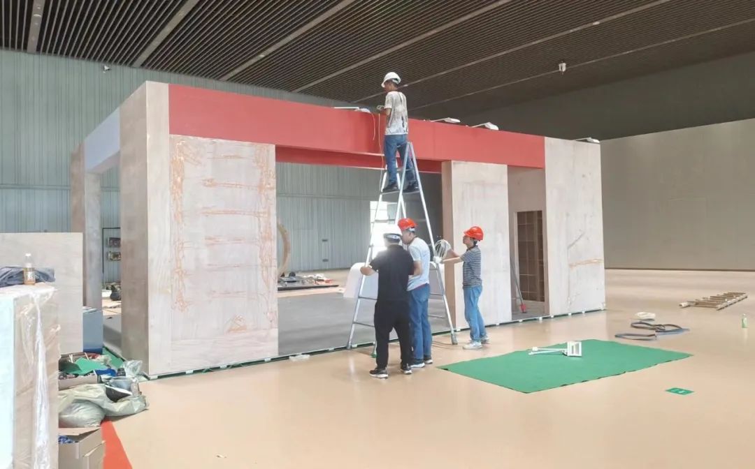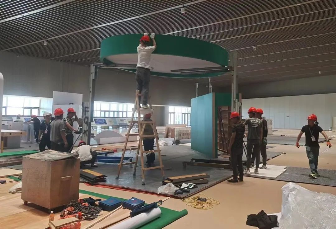 距离2023上合博览会开幕还有12天,青岛·上合之珠国际博览中心开始闭馆冲刺搭建工作。场馆内一派忙碌景象,近百名工作人员有条不紊。