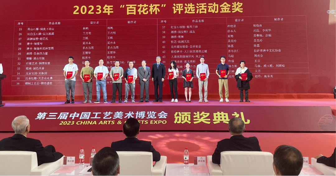 5月26日—29日,2023中国工艺美术博览会在南京国际博览中心举行。我院选送作品《刺绣茶席—流光绣彩》从2万余件大师工匠精品中脱颖而出,荣获2023年“百花杯”中国工艺美术精品奖金奖。该作品由设计艺术学院苗族织染绣研发团队佟强老师设计,是柳州市唯一获得2023年“百花杯”金奖作品。我院已连续两年斩获该赛事最高奖项。