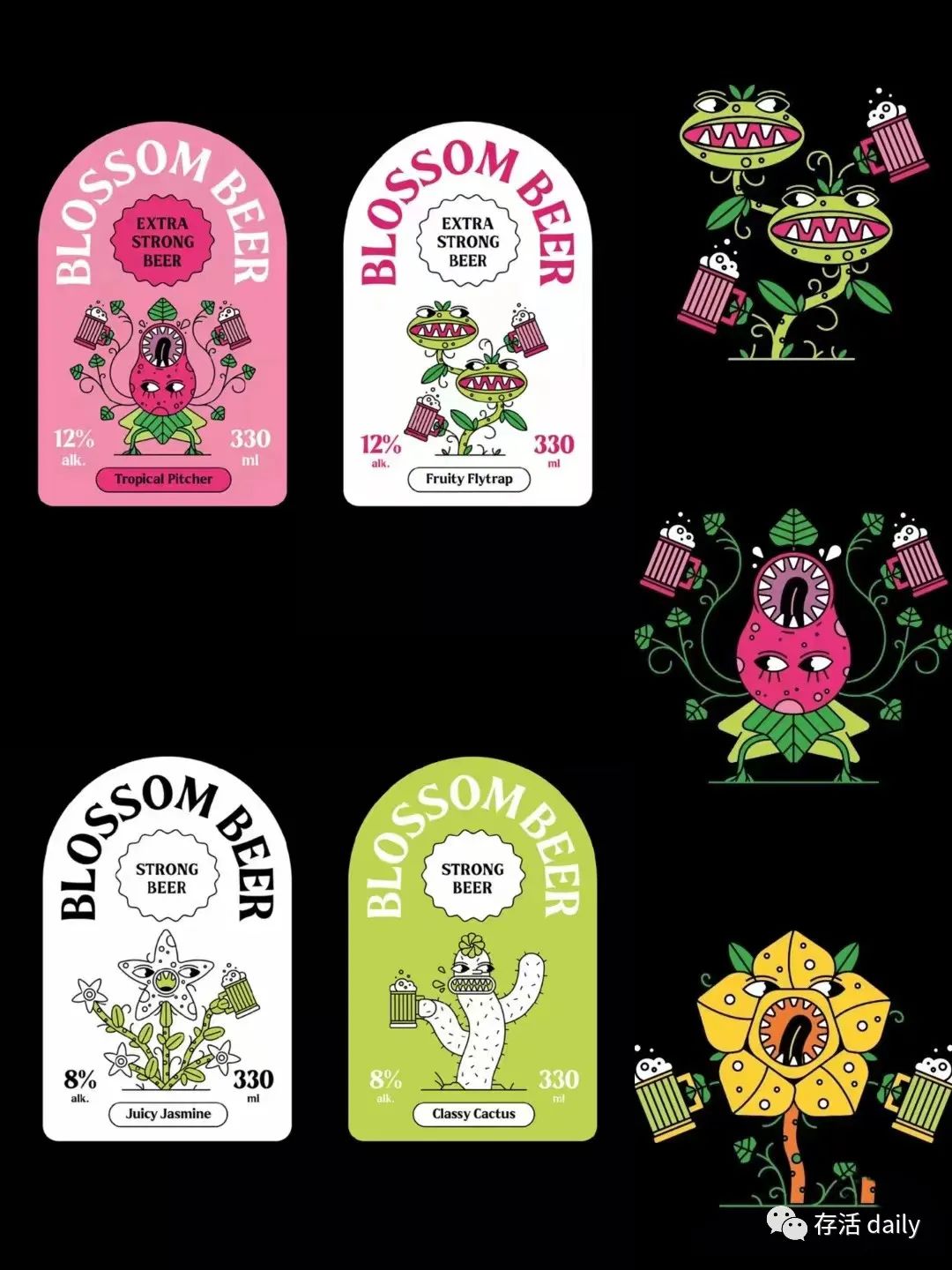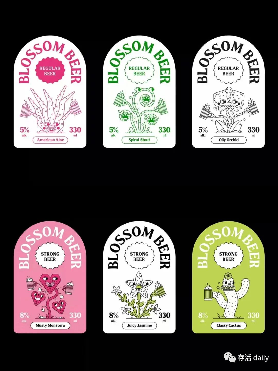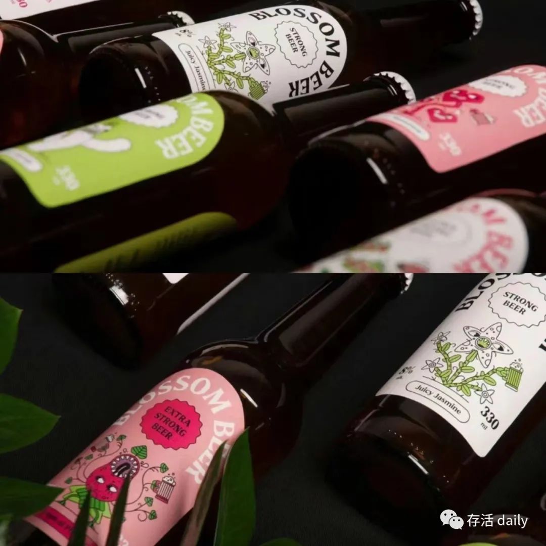 小众精酿,BLOSSOM啤酒包装设计,瓶贴使用了可爱的小插画表现出啤酒的口味。