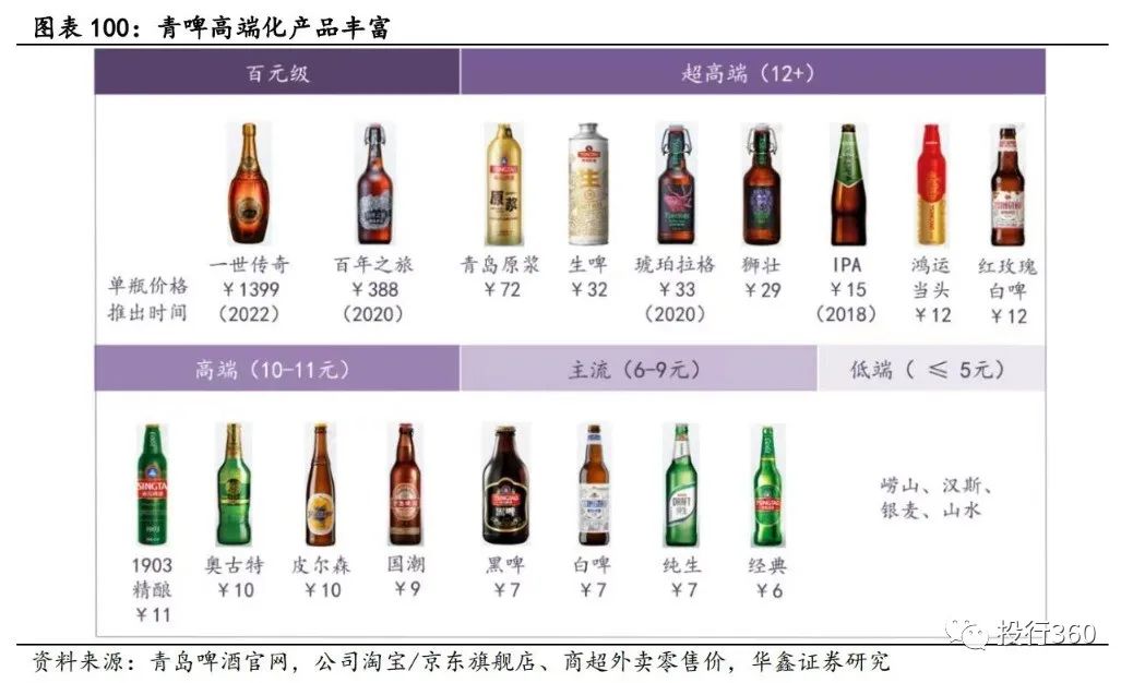 华鑫证券指出,在百元级产品上,青岛啤酒率先在2020年率先推出“百年之旅”,售价388元,并在2022年推出价值1399元的“一世传奇”;超高端产品方面,青岛啤酒布局丰富,产品价位最高,均价约29元/瓶,最高达72元/瓶。