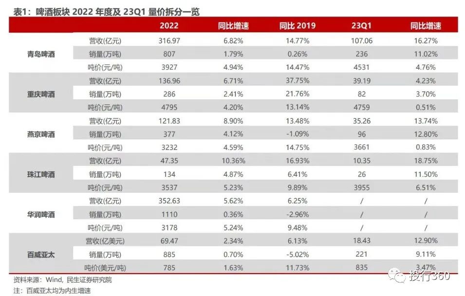 去年消费整体偏低迷,啤酒行业则堪称一抹亮色。民生证券王言海5月8日发布的研报指出,2022年啤酒板块营收稳增、归母净利润高增;2023年伴随疫情扰动褪去,下游场景逐步复苏,叠加成本压力边际缓解,23Q1营收、利润相比去年同期明显提速。国盛证券符蓉预计2023年将是啤酒龙头弱势区域持续扭亏、释放利润的一年。