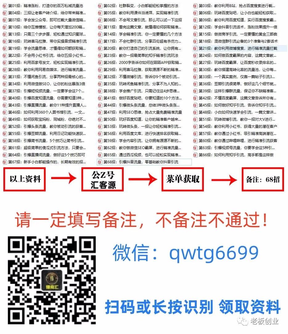 以上就是关于白酒精准客户引流的一些方法。总得来说,成功的引流离不开好的产品、优秀的定位和专业的运营策略。如果你想要了解更多的获客方法,可以关注公众号《汇客源》领取《引流涨粉68招》。