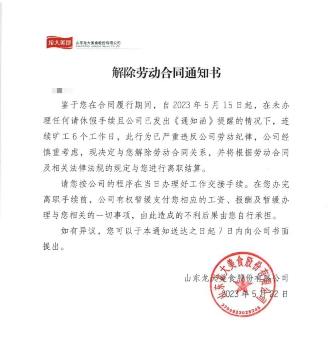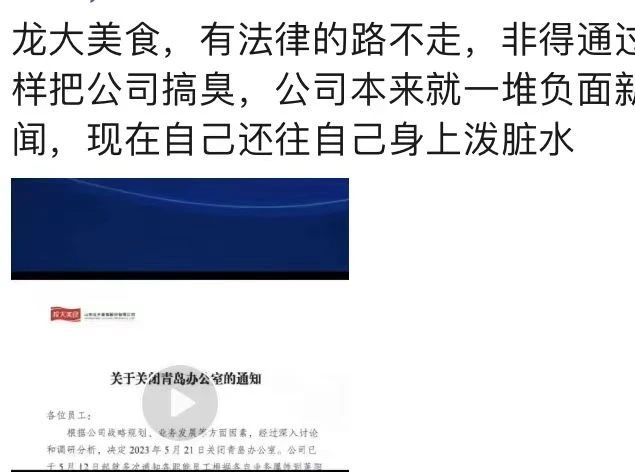 上月中旬,龙大美食董事长余宇因个人原因突然辞职,不到半月时间,龙大美食青岛办公室也突然关门,员工更是遭到暴力裁员。小编发现,在爱企查上找到“龙大食品集团有限公司青岛办事处”信息已显示处于吊销状态。据有关媒体报道,有龙大美食员工在朋友圈发文,直指公司违法解约。起因是龙大美食5月18日发布的一份《关于关闭青岛办公室的通知》。通知称,根据战略规划、业务发展等因素,将于5月21日关闭青岛办公室,并已于5月12日起陆续多次通知相关人员调整事宜。然而,龙大美食青岛办公室员工则表示,事实并非通知中所言,他们在一份书面回复中对事情做了详细说明。此后,青岛多名员工收到《解除劳动合同通知书》(下文简称”通知“),理由是“旷工”,双方就此产生争议。据青岛多名员工反馈,5月23日、24日他们已陆续收到邮寄的纸质版《解除劳动合同通知书》,并表示:在此一系列事件产生并持续演变过程,青岛办公室员工通过邮件、电话等形式与公司高层、人力部门领导进行沟通联系,均未正面回应员工对变更办公地点、变更打卡规则、变更工作岗位、两次判定“旷工”等问题的问询。“目前,我们已申请劳动仲裁,仲裁院相关负责人正和龙大美食协商中。”为全面了解事实,媒体致电龙大美食人力总经理,其回复称:公司由公关部统一对外接受采访,可在官网查询公关部电话。随即致电龙大美食官网上的400电话,工作人员接听后表示会转给相关部门,但媒体依然未收到任何回复。上月初,龙大美食发布了2022年财报。数据显示,公司2022实现营业收入 161.16 亿元,较上年同期下降 17.39%;实现归属于上市公司股东的净利润 0.75 亿元, 较上年同期增长 111.45%,顺利扭亏为盈。报告期内,公司食品板块实现收入 16.52 亿元, 同比增长 7.10%,其中预制菜业务实现收入 13.14 亿元,累计开发新产品185款。同比增长 11.16%。食品板块占公司营业收入的比例由 7.90%提升至 10.25%。众所周知,龙大美食坚持以预制菜为核心的食品主体,以屠宰和养殖为两翼支撑的一体两翼。2023年为扩大食品业务的营收规模,加快公司战略升级速度,提升公司食品板块的营收占比,降低传统行业周期对公司的影响。在渠道方面通过持续深耕山东基地市场,持续打造四川样板市场,以北京、上海、苏州、天津、石家庄等市场为突破口,积极布局华北、华东等地区。另外在公司发出的通知中,也发现对于青岛办公室员工安置地点是在成都,也就是说青岛办公室的关闭是为了打造四川样板市场而补充人才资源,更好打造四川市场。回头来看,导致员工与龙大美食发生劳动分歧的主要原因是信息没有做事先沟通,让员工措手不及,如果相关负责人能提前告知,也就不会出现这样损失近20名常驻员工情况。如果说员工是一滴清水,那企业就是江河湖海;如果说员工是一粒种子,那企业就是肥沃土地……一滴清水注入江河湖海,将汇成奔放、豪迈、辽阔壮观的大海;一粒种子埋入肥沃的土壤,将会生机勃勃、茁壮成长......它们都找准了自己的位置,共生共荣不可分。员工和企业就是这样一种相互依存的关系。俗话说:众人拾柴火焰高。一个企业由很多基层单位组成,而基层单位的构成主要是员工,而员工是企业价值的直接创造者。办公室、供应、销售,都是企业的坚强后盾,每一个环节都缺一不可,无论哪一环节出现问题,都会影响企业的整体发展。环环相扣,只有协力合作,才能使企业快速发展。只有稳定员工,才能稳定企业。龙大美食致力于“让天下没有难做的美食”这背后离不开每一位员工的支撑,如果不重视该事件,处理好内部管理问题,很难让天下没有难做的美食。
