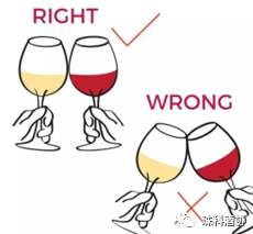 此外,由于高脚杯是晶莹剔透的,手握杯肚会在酒杯上留下手印,不太美观。葡萄酒杯口部分又脆又薄,力度把控不好很容易磕坏,所以碰杯的时候要选择杯肚的部分,交叉45度左右,轻碰一下。