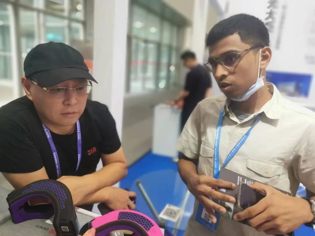 吉声技术展位负责人向走访团展示了具备对讲功能的滑雪镜,并详细介绍产品特色:使用附送卡的流量来沟通,4G信号覆盖的区域都可以更流畅更私密的沟通,不限距离 对讲,支持1000人超大群组对讲更大程度上满足人数多、场地大的使用需求,现场吸引海外采购商咨询。
